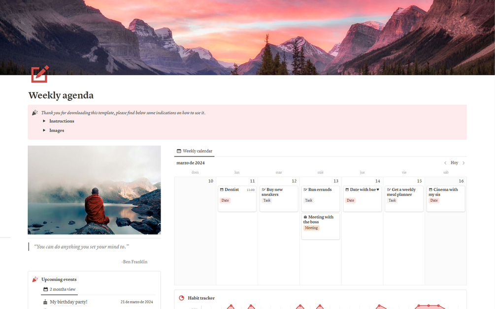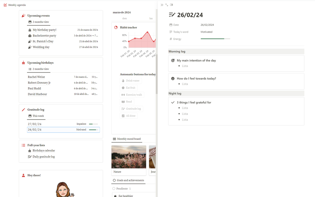 Elevate your day-to-day planning with this weekly agenda, the ultimate solution to keep your calendar organized. Stop using 3 different apps to keep track of your plans, habits and goals, simplicity is key. Designed with special attention to aesthetics, in this template you will find all you need to get yourself ahead of plan, track your daily habits and introduce yourself to the art of journaling with the gratitude log. No more birthdays will be forgotten, no more events will be missed.